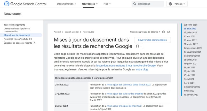 Google a développé sa propre page d’historique comportant ses mises à jour (depuis 2020). Cela permet notamment de retrouver les explications Google.