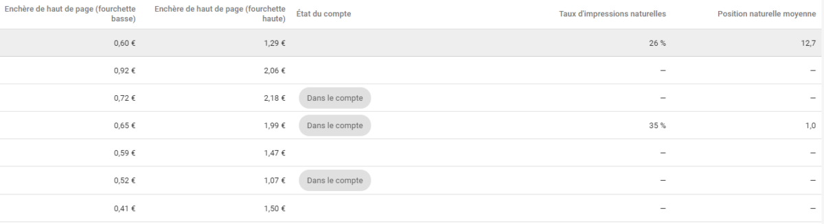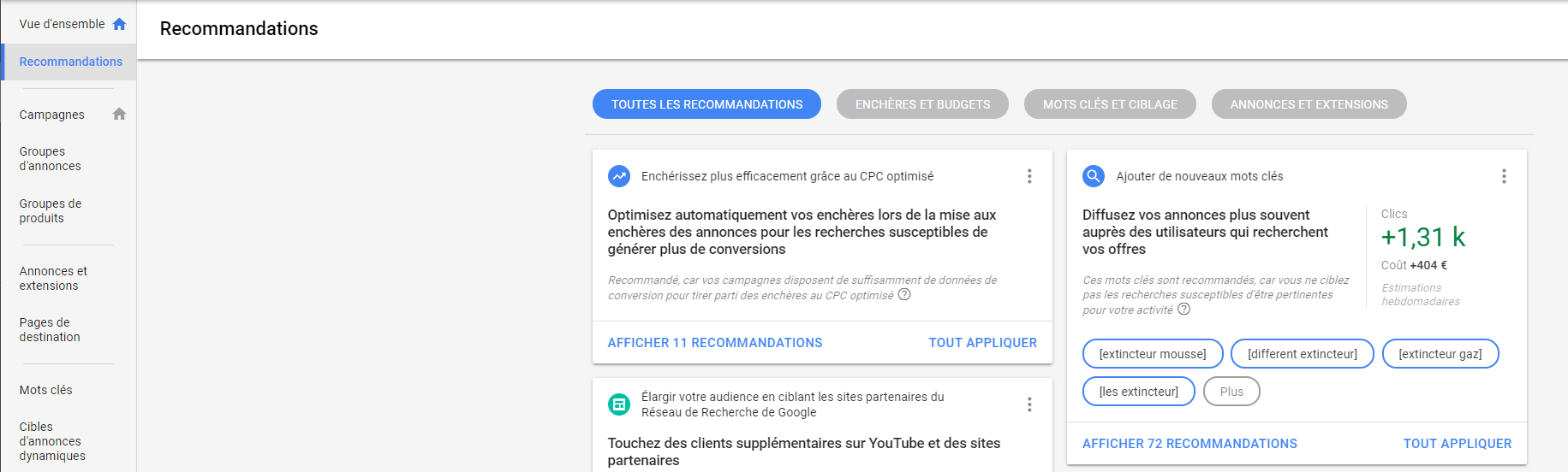 La page recommandations est censée aiguiller les annonceurs sur les potentielles pistes d’améliorations afin d’obtenir de meilleurs résultats.