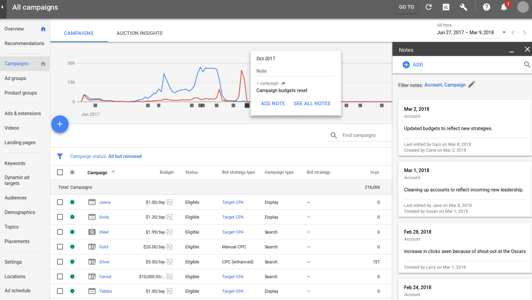 Cette fonctionnalité sera disponible dans quelques semaines, suite à l’annonce au SMX West de San José par le Directeur de la gestion des produits AdWords, Anthony Chavez. Cette nouveauté permettra d’insérer des commentaires directement dans un compte AdWords juste en dessous du graphique, et cela à n’importe quel niveau (campagnes, groupes d’annonces, mots-clés…). Ces commentaires seront visibles par toutes les personnes ayant un accès au compte. Un outil qui va s’avérer pratique pour notifier des changements significatifs comme une hausse élevée des performances.