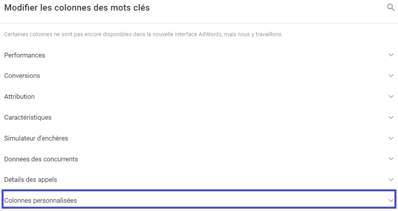 On pouvait déjà retrouver les colonnes personnalisées sur l’ancienne interface au niveau des campagnes et des groupes d’annonces. Avec la mise à jour de l’interface AdWords, vous pourrez désormais accéder à ces colonnes au niveau des annonces et des mots-clés. Cette nouvelle disposition reste une bonne nouvelle pour les annonceurs ayant l’habitude de combiner les informations de plusieurs colonnes pour obtenir l’information souhaitée.