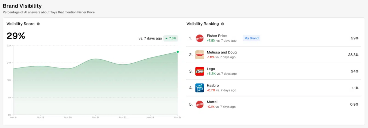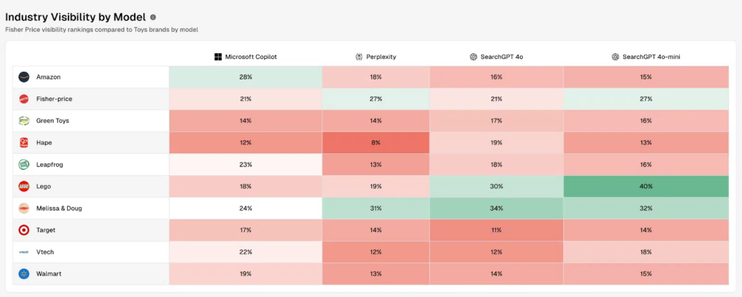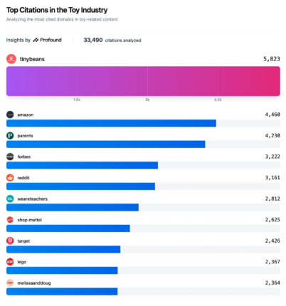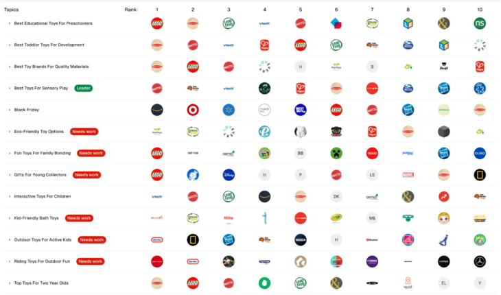 Based on a study conducted on toy retailers, the moteurs de recherche Land site web revealed some relevant information provided by Profound. The analysis tool can, en particulier, provide a ranking of visibilité de la marque on a given topic, based on conversations generated on propulsé par l'IA search platforms. The percentage shown Par conséquent corresponds to the rate of AI responses that mention the brand in question: